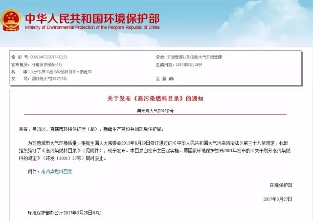 關(guān)于發(fā)布《高污染燃料目錄》的通知國環(huán)規(guī)大氣[2017]2號各省、自治區(qū)、直轄市環(huán)境保護(hù)廳(局),新疆生產(chǎn)建設(shè)兵團(tuán)環(huán)境保護(hù)局: 為改善城市大氣環(huán)境質(zhì)量,根據(jù)全國人大常委會(huì)2015年8月29日修訂通過的《中華人民共和國大氣污染防治法》第三十八條規(guī)定,我部組織編制了《高污染燃料目錄》(見附件),現(xiàn)予發(fā)布。...