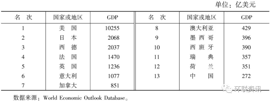 ▲1970年部分國家的GDP數(shù)據(jù)。此時的日本已經(jīng)成為僅次于美國的第二大經(jīng)濟體,占到美國GDP的20%有余