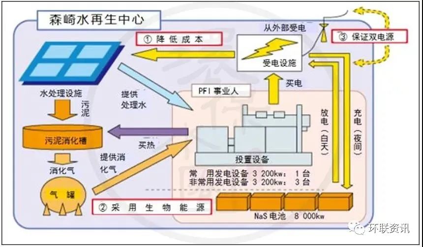森崎水回收中心東部還設(shè)有有四個消化罐,用來從有機污泥成分中產(chǎn)生甲烷氣體,這將減少最終的污泥體積。每個消化罐內(nèi)徑28米,深度19.5米(容積12000立方米),消化溫度約為50攝氏度。為了構(gòu)建可持續(xù)發(fā)展和循環(huán)型社會,為下一代營造宜人的全球環(huán)境,森崎水回收中心正在努力利用污水處理過程中產(chǎn)生的能量,污泥和再生水來獲得資源和能源。夏季的廢水溫度低于夏季,冬季的溫度高于大氣溫度,“城市供熱”系統(tǒng)正是利用廢水溫差來實現(xiàn)區(qū)域供熱和制冷的。“城市供熱”系統(tǒng)的采用減少了化石燃料(石油,天然氣等)的使用,并有助于減少空氣污染物和電力消耗。將從水再生中心獲得的處理后的廢水供應(yīng)到新的索尼公司大樓,以冷卻大樓的空調(diào)設(shè)備??照{(diào)產(chǎn)生的廢熱,通過熱交換器處理后被廢水吸收。該項目的環(huán)境影響是,由于冷卻設(shè)備運行所需的電力和自來水的減少,CO2排放量每年減少約22 t。此外,與將所有熱量釋放到大氣中的常規(guī)方法相比,該項目中的熱量釋放到處理后的廢水中,有助于應(yīng)對熱島現(xiàn)象。 生物質(zhì)發(fā)電(與私營企業(yè)合作)廢水處理方法中產(chǎn)生的污泥在消化池中加熱,然后污泥中的有機物變成甲烷氣,減少了污泥量。過程中產(chǎn)生的甲烷是生物質(zhì)(可再生)能源,可以被用作發(fā)電設(shè)備的燃料,每年可發(fā)電22.8 kWh。在發(fā)電設(shè)施的安裝和管理方面,森崎率先引進了PFI(私人融資計劃:是一種公私合作的方法,將資金、技術(shù)知識和管理技能從私營部門帶到公共機構(gòu)),它可以降低設(shè)施建設(shè)或維護/管理的成本。它也通過可交易的綠色證書作為環(huán)境價值能源轉(zhuǎn)讓給第三方。該中心還安裝了世界上最大的NaS電池設(shè)備,用于全天的分布式電力負載:在夜間有效地使用低成本的電力,并在用電高峰期減少使用電池供電。