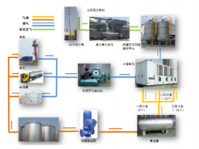 在產(chǎn)品罐區(qū)及碼頭裝船區(qū),油氣經(jīng)過(guò)“收集-輸送-冷凝(吸收)-催化氧化”等工藝處理,最終達(dá)標(biāo)排放。