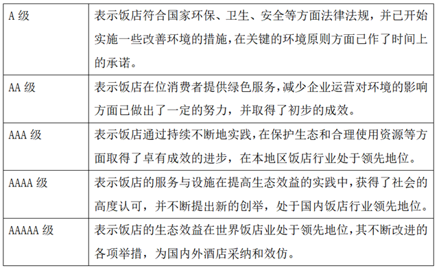 我國于2007年發(fā)布了《綠色飯店等級評定規(guī)定》,根據(jù)企業(yè)在提供綠色服務(wù)、保護(hù)環(huán)境等方面做出的努力將綠色酒店分為五個等級,具體內(nèi)容如下。