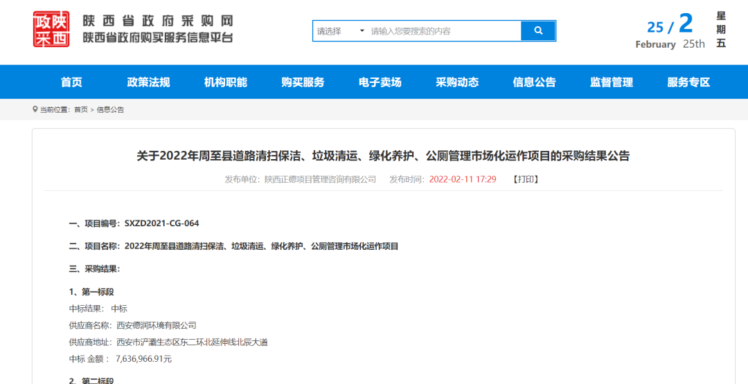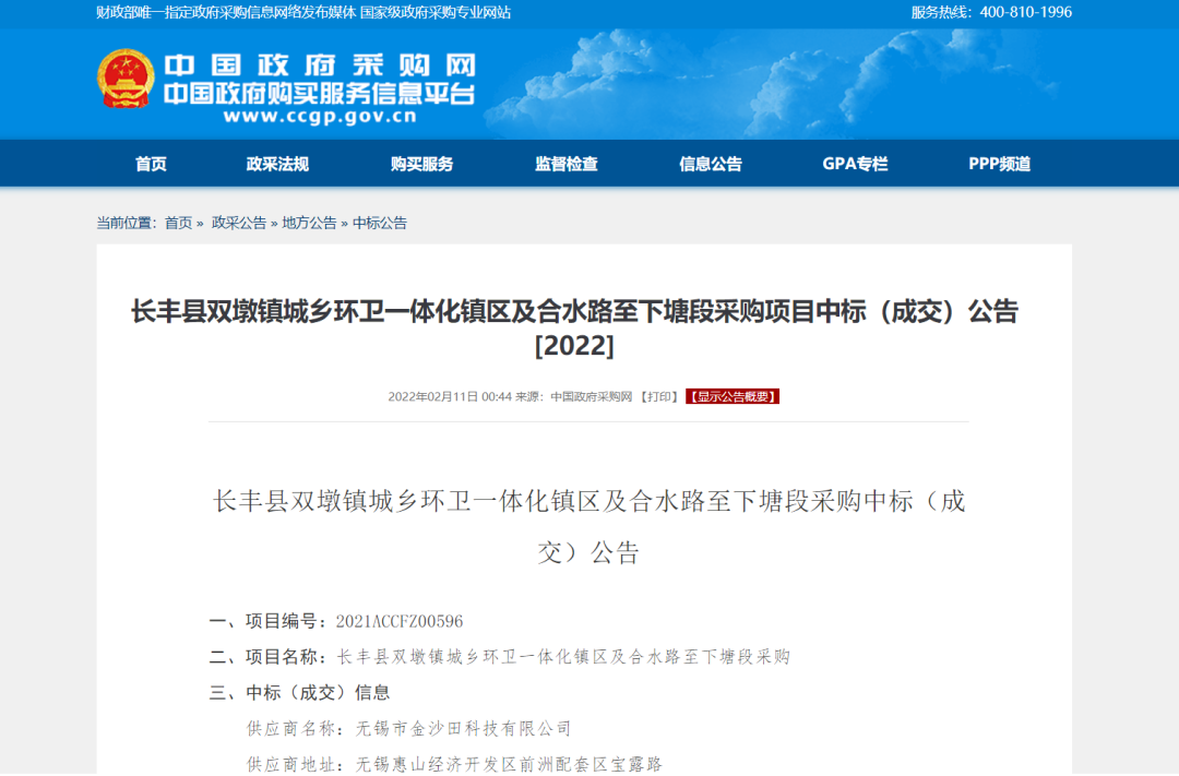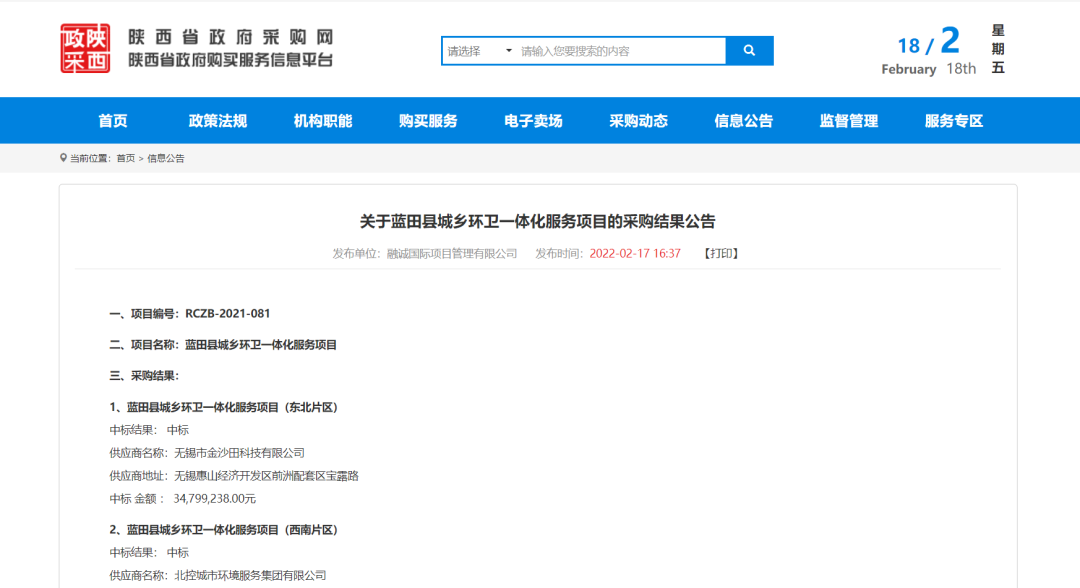 金沙田六天接連斬獲3個(gè)環(huán)衛(wèi)項(xiàng)目,總金額達(dá)4.41億元! 來(lái)源 | 環(huán)衛(wèi)科技網(wǎng)環(huán)衛(wèi)科技網(wǎng)訊,金沙田六天接連斬獲3個(gè)環(huán)衛(wèi)項(xiàng)目,總金額達(dá)4.41億元!藍(lán)田縣城鄉(xiāng)環(huán)衛(wèi)一體化服務(wù)項(xiàng)目2月17日,陜西省政府采購(gòu)網(wǎng)發(fā)布藍(lán)田縣城鄉(xiāng)環(huán)衛(wèi)一體化服務(wù)項(xiàng)目的采購(gòu)結(jié)果公告。金沙田中標(biāo)藍(lán)田縣城鄉(xiāng)環(huán)衛(wèi)一體化服務(wù)項(xiàng)目(東北片區(qū))標(biāo)段,中標(biāo)金額總計(jì)約3.48億元,特許經(jīng)營(yíng)期10年,其中包括1年建設(shè)期。該標(biāo)段范圍覆蓋藍(lán)關(guān)街道辦(北環(huán)路以北部分)、三里鎮(zhèn)區(qū)、華胥鎮(zhèn)區(qū)及洩湖鎮(zhèn)區(qū)(包含藍(lán)田縣工業(yè)園、西北家具工業(yè)園)。未來(lái),金沙田科技將負(fù)責(zé)提供城區(qū)道路清掃保潔、垃圾收轉(zhuǎn)運(yùn)、公廁和文明驛站運(yùn)營(yíng)、綠化養(yǎng)護(hù)、垃圾分類(lèi)、環(huán)衛(wèi)智慧平臺(tái)等環(huán)衛(wèi)服務(wù)。周至縣道路清掃保潔、垃圾清運(yùn)、綠化養(yǎng)護(hù)、公廁管理市場(chǎng)化運(yùn)作項(xiàng)目2月11日,陜西省政府采購(gòu)網(wǎng)發(fā)布周至縣道路清掃保潔、垃圾清運(yùn)、綠化養(yǎng)護(hù)、公廁管理市場(chǎng)化運(yùn)作項(xiàng)目采購(gòu)結(jié)果公告,第二標(biāo)段中標(biāo)方為金沙田,中標(biāo)金額為460.5萬(wàn)元,服務(wù)期限1年。長(zhǎng)豐縣雙墩鎮(zhèn)城鄉(xiāng)環(huán)衛(wèi)一體化鎮(zhèn)區(qū)及合水路至下塘段采購(gòu)項(xiàng)目2月11日,中國(guó)政府采購(gòu)網(wǎng)發(fā)布長(zhǎng)豐縣雙墩鎮(zhèn)城鄉(xiāng)環(huán)衛(wèi)一體化鎮(zhèn)區(qū)及合水路至下塘段采購(gòu)項(xiàng)目中標(biāo)(成交)公告,中標(biāo)方為金沙田,中標(biāo)金額為8792.5萬(wàn)元,服務(wù)期限1年,合同1年1簽,續(xù)簽不超過(guò)2年。1、雙墩鎮(zhèn)鎮(zhèn)區(qū)范圍內(nèi)的市政道路、重要道路及道路兩側(cè)的清掃保潔;2、雙墩鎮(zhèn)鎮(zhèn)區(qū)范圍內(nèi)街道、公園、游園、廣場(chǎng)等衛(wèi)生保潔;3、本次招標(biāo)范圍內(nèi)所有生活垃圾收集、轉(zhuǎn)運(yùn)至陶樓合肥長(zhǎng)豐皖能環(huán)保電力有限公司;4、雙墩鎮(zhèn)鎮(zhèn)區(qū)范圍內(nèi)繁華商業(yè)區(qū)、人群密集街道及主要交通道路路口文明勸導(dǎo)服務(wù);6、建立智慧環(huán)衛(wèi)信息管理系統(tǒng)平臺(tái)。接下來(lái)的3月份,金沙田又將會(huì)有哪些亮眼表現(xiàn)?來(lái)源 | 環(huán)衛(wèi)科技網(wǎng)