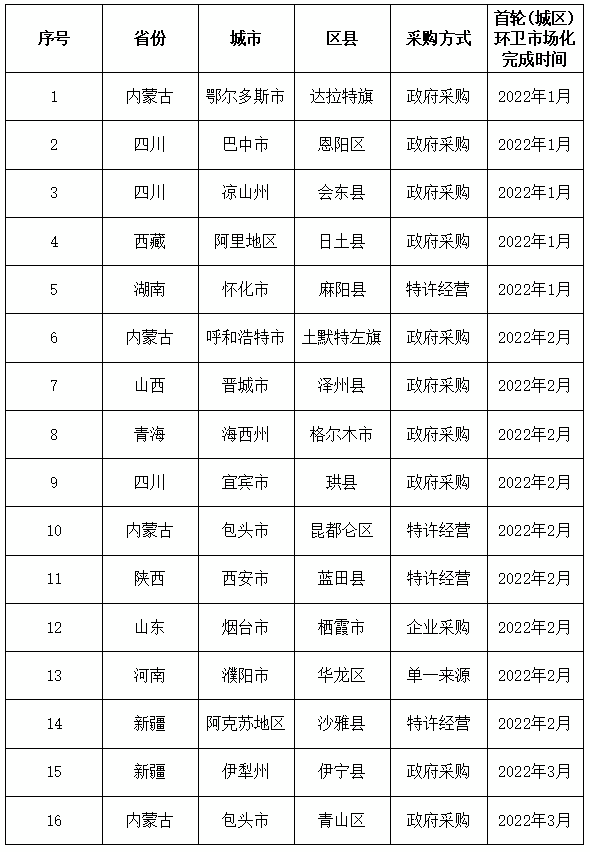 截止2021年12月31日,全國完成城區(qū)(首輪)環(huán)衛(wèi)市場化改革的區(qū)縣數(shù)量為2006個,城區(qū)環(huán)衛(wèi)市場化率為70.34%。進一步的數(shù)據(jù)分析顯示,在2022年度完成首輪環(huán)衛(wèi)市場化改革的16個區(qū)縣,采取“非政府采購”方式的區(qū)縣占比達到37%,接近四成。在采取“非政府采購”方式的6個區(qū)縣中,其中:采取“特許經(jīng)營”方式的區(qū)縣有4個,采取“企業(yè)采購”和“單一來源采購”方式的區(qū)縣各1個。附1:2022年度完成城區(qū)環(huán)衛(wèi)市場化(16個)區(qū)縣分布附2:2022年度完成城區(qū)環(huán)衛(wèi)市場化區(qū)縣具體明細