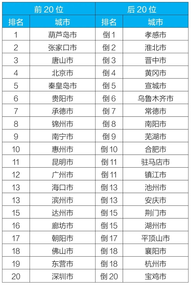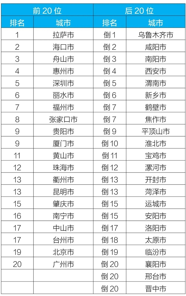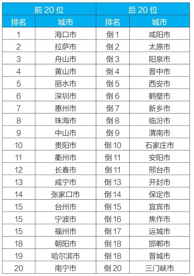 3月,168個重點(diǎn)城市中,??凇⒗_和舟山市等城市空氣質(zhì)量相對較好(從第1名至第20名);咸陽、太原和陽泉市等城市空氣質(zhì)量相對較差(從倒數(shù)第1名至倒數(shù)第20名),見附表1。