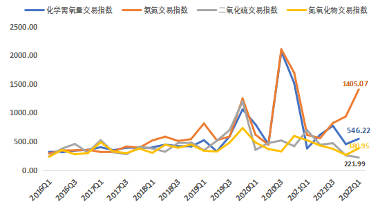 從環(huán)比情況看,化學(xué)需氧量、氨氮、氮氧化物環(huán)比分別增長50.20%、22.53%、5.40%,二氧化硫成交量環(huán)比下降35.52%;從同比情況看,化學(xué)需氧量、氨氮、二氧化硫、氮氧化物成交量同比分別增長54.13%、121.53%、35.07%、36.14%。