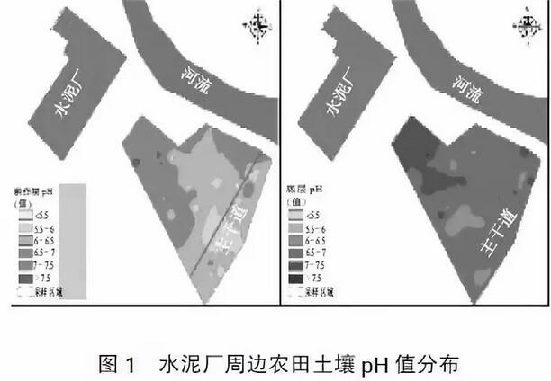 統(tǒng)計(jì)分析結(jié)果表明,上層土壤(0~20cm)pH 值在5.3~7.7 之間波動(dòng),均值為6.50,下層土壤(20~40 cm)pH 值在6.14~7.65 之間波動(dòng),均值為6.81。整體情況看,上層土壤pH 值整體低于下層,表層土壤變幅在1~2 個(gè)單位,下層土壤降幅為0.3 個(gè)單位左右??臻g變異結(jié)果表明(見圖1),水泥廠附近的農(nóng)田土壤pH 值整體在7 左右,距離水泥廠越遠(yuǎn)農(nóng)田土壤pH 值越低,但該區(qū)域靠近公路,公路對(duì)該區(qū)域農(nóng)田土壤pH 值降低影響較大,而且隨著影響時(shí)間的延長(zhǎng),底層土壤也受到了影響。