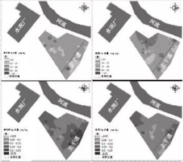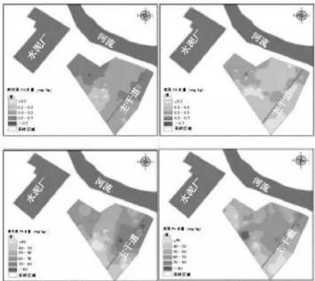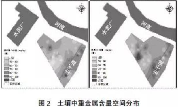 插值結(jié)果表明,該區(qū)域農(nóng)田土壤重金屬含量以水泥廠和公路為中心呈輻射狀分布。地統(tǒng)計(jì)學(xué)研究方法可以對(duì)區(qū)域土壤污染源的識(shí)別加以指導(dǎo)和檢驗(yàn)。由于污染場(chǎng)地周邊農(nóng)田土壤重金屬含量的超標(biāo)與周邊污染源的影響密切相關(guān),因此要密切關(guān)注污染源對(duì)周邊農(nóng)田土壤重金屬的污染問(wèn)題。