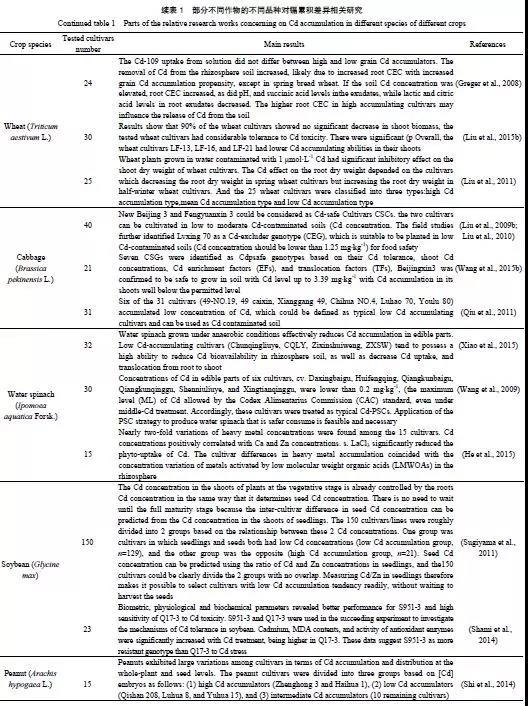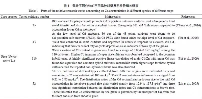 不同作物種類對鎘的累積量有所差異,例如鎘污染土壤中豆類作物(豆科Leguminosae)鎘累積量較低,根菜類蔬菜(傘形科Umbelliferae和百合科Liliaceae)鎘累積量居中,而葉類蔬菜(菊科Asteraceae和藜科Chenopodiaceae)鎘累積量相對較高。而同種作物的不同品種(基因型)的鎘吸收累積也存在差異,已有研究表明,水稻(Oryza sativa L.)、大麥(Hordeum vulgare L.)、玉米(Zea maysL.)、小麥、胡蘿卜(Daucus carota L.)、大白菜、豌豆(Pisum sativum L.)、土豆(Solanum tuberosum L.)、花生(Arachis hypogaea L.)及空心菜(Ipomoea aquatica Forsk.)等農(nóng)作物的不同品種鎘吸收累積量差異較大。表1 列舉了部分有關(guān)不同種類作物的基因型差異對鎘吸收累積的研究及相關(guān)結(jié)論,已有的研究均表明篩選低累積作物對于中低濃度鎘污染土壤的安全利用具有可行性。
