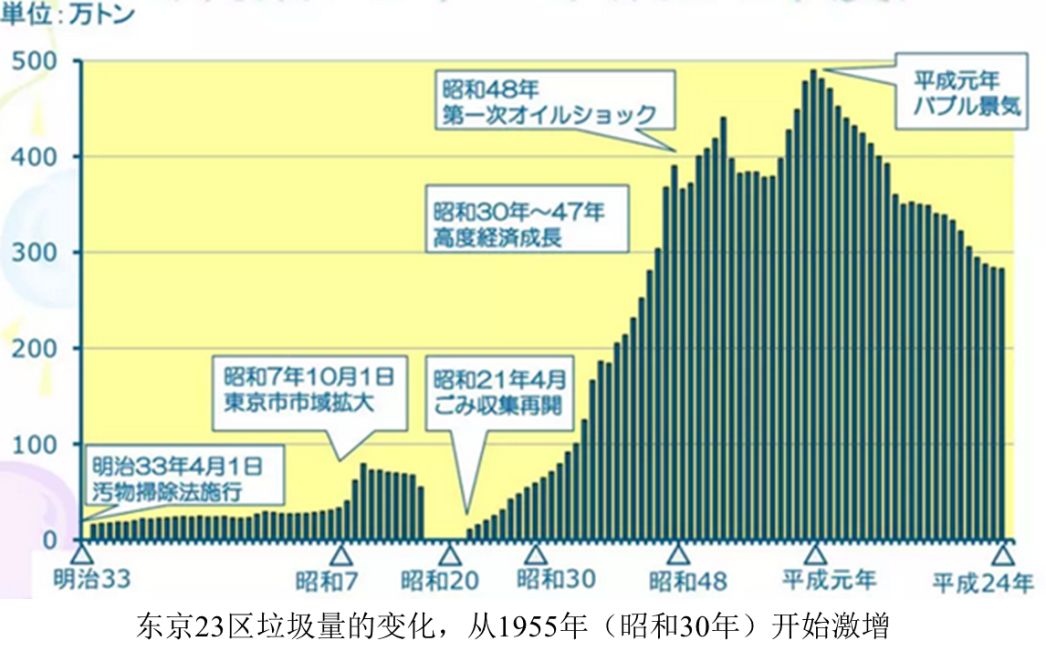 殊不知像日本這樣一個堪稱典范的潔凈國家也是從一段污染肆掠的黑暗歷史中走過來的。1955年起,日本進入了前所未有的經(jīng)濟高速增長時期,經(jīng)濟增量與垃圾增量同步爆發(fā),當時的日本也是垃圾隨處亂扔,污物隨便投棄。