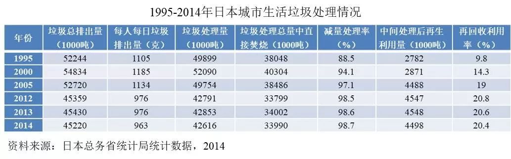 從1995年至2014年日本城市生活垃圾的處理情況看,日本垃圾減量處理率、再回收利用率呈逐年增長趨勢,這主要得益于日本先進的垃圾回收處理技術(shù)。